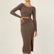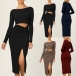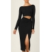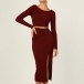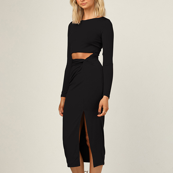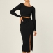Sexy Hollow Out High Waist Slit Hem Long Sleeve Solid Color Slim Fit Dress