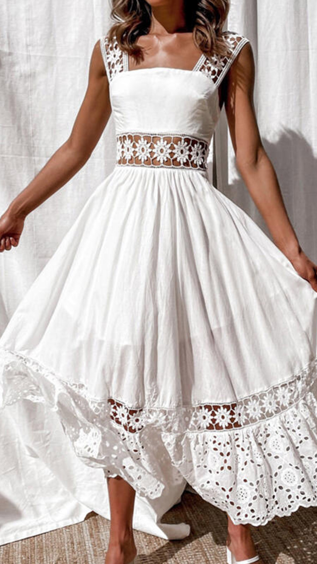 You are sure to win more eyes when you dress yourself up with this dress. Its alluring design details like backless,high waist and hollow out lace spliced design make this piece full of flirty and feminine appeal. Wanna be the focus? Then slip into this dress!