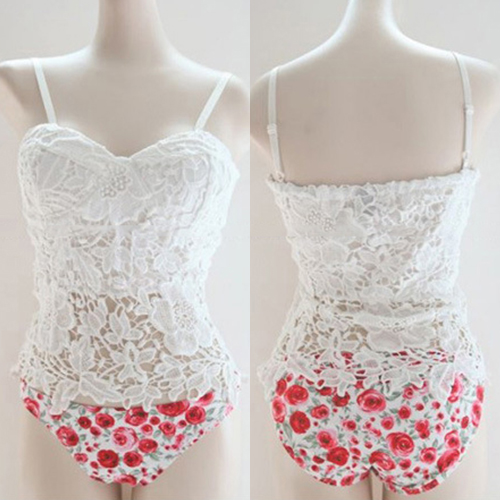 and a printed briefs. Bra with detachable shoulder strap and hollow out lace spliced design.