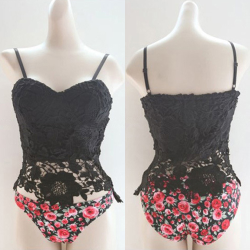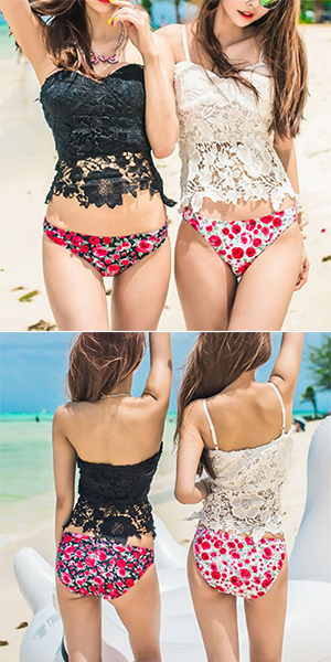 Sexy Hollow Out Lace Spliced Bandeau Bra + Printed Briefs Bikini Set