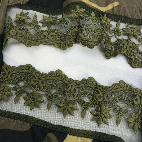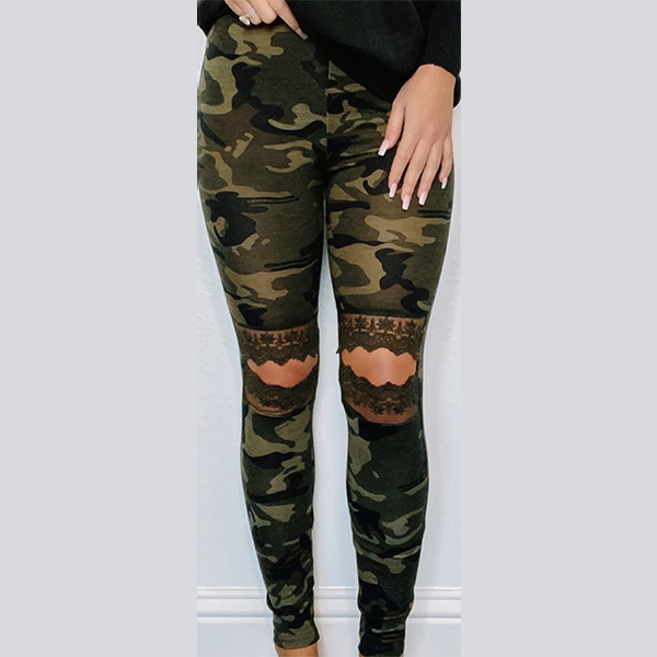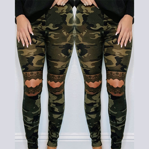 Update your pants collections with this little piece. The camouflage printed details and hollow out lace spliced design at the knee part make this piece look so eye-catching and distinctive,while the high waist and fit silhouette design can showcase your slender legs. Like this style? Then why not have a try it?
