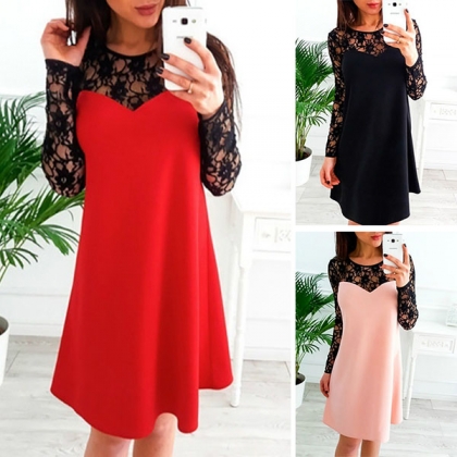 Sexy Hollow Out Lace Spliced Long Sleeve Round Neck Dress