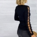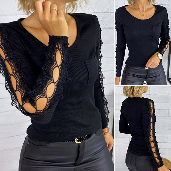 What makes this top look so stylish and attractive? It owes to the hollow out lace spliced design at the sleeve part. Comes with a classic yet flattering black tone,with long sleeve and a fit silhouette,this piece can easily arouse your attention.
