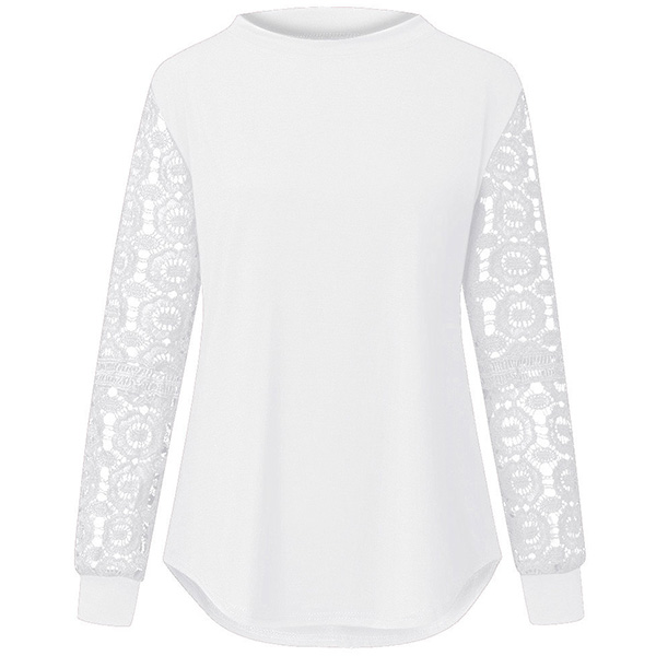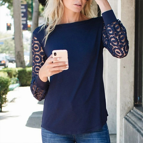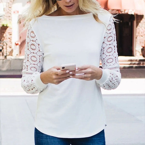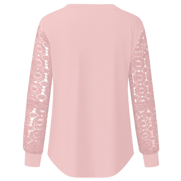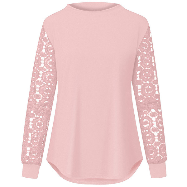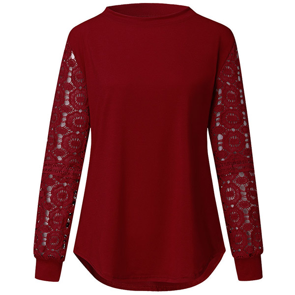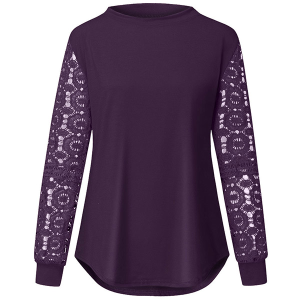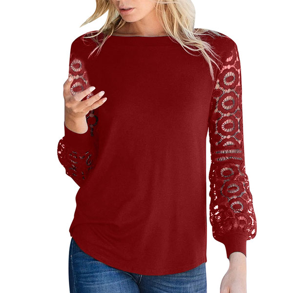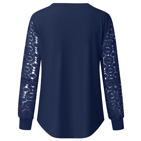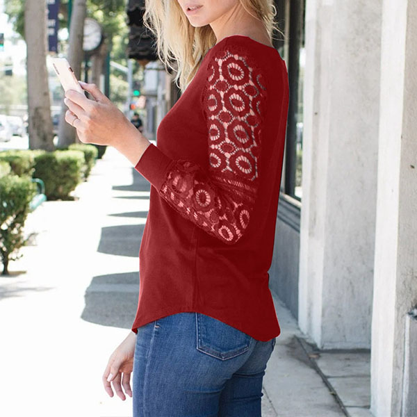 Sexy Hollow Out Lace Spliced Long Sleeve Round Neck T-shirt