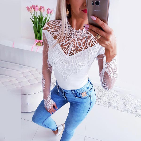 You deserve to win more eyes when you slip into this top! Solid color style,the hollow out lace spliced design makes this piece look so sexy and alluring,the fit silhouette design can demonstrate your perfect body-line. Try to match with your favourite bottom to finish a stunning dress up.