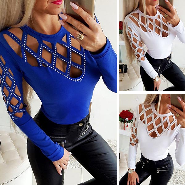 You can look very sexy and seductive when you wear this t-shirt. Finished with long sleeve,round neck and a fit silhouette design,this piece can demonstrate your perfect body-line,while the hollow out details can help you arouse more eyes. If you are bold enough,you can just have a try it.