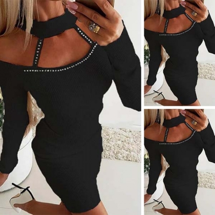 Sexy Hollow Out Long Sleeve Slim Fit Rhinestone Spliced Halter Dress