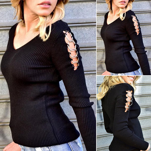 Only need one glance,you would be attracted by this chic and unique top. Comes with a classic yet flattering black tone,the hollow out details at the sleeve part and v-neck design can enhance your feminine appeal. All-match design allows to be matched with different style bottoms.