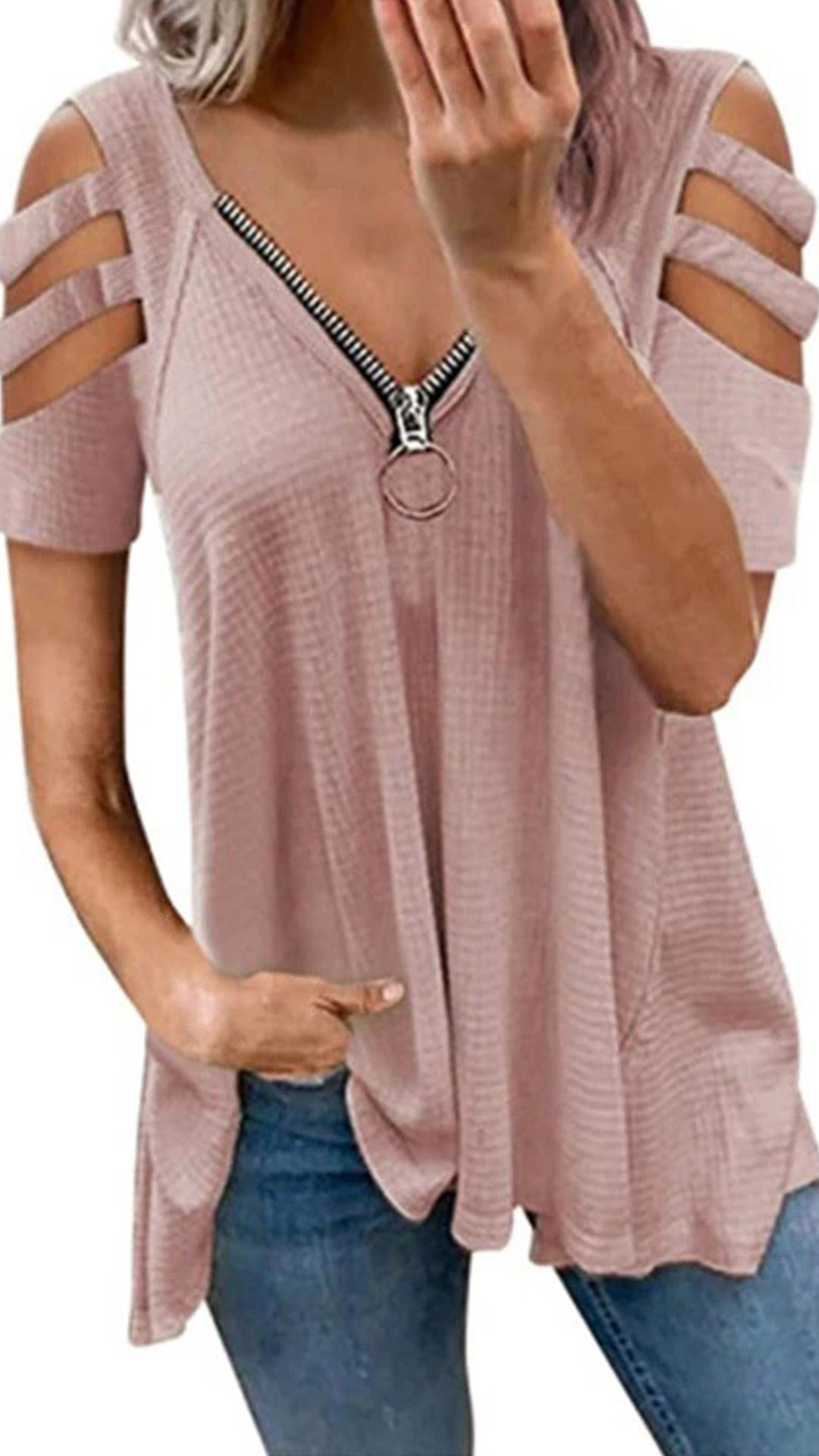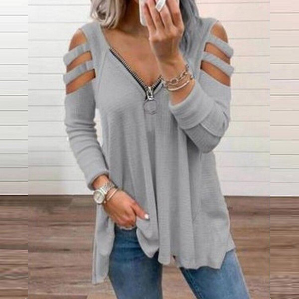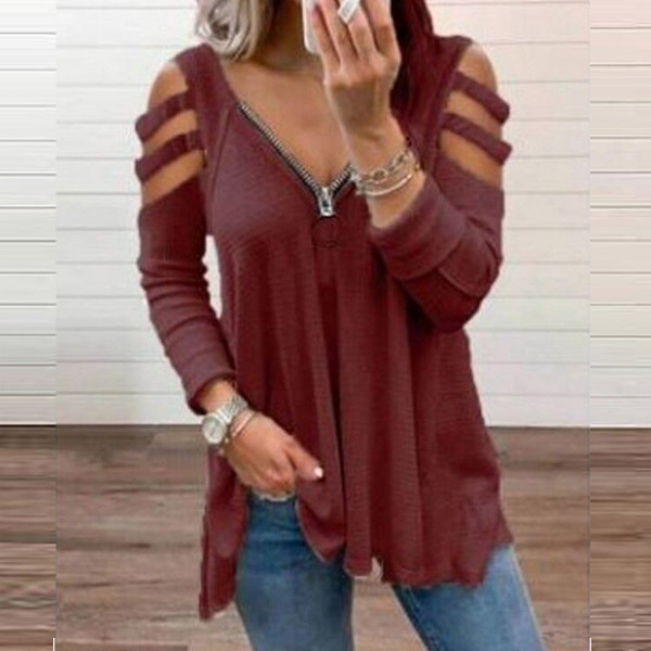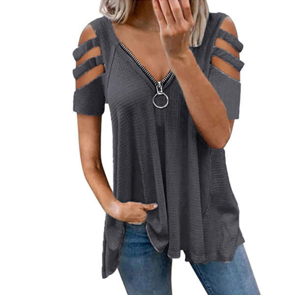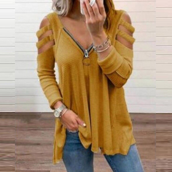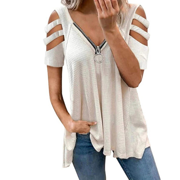 Don't like too simple and dull t-shirt? Then might we suggest you this piece? It comes with a solid color,the off-shoulder and zipper v-neck design make this piece look so sexy and distinctive. Crafted from soft and breathable fabric,with a loose silhouette,this piece is worth to arouse your attention.