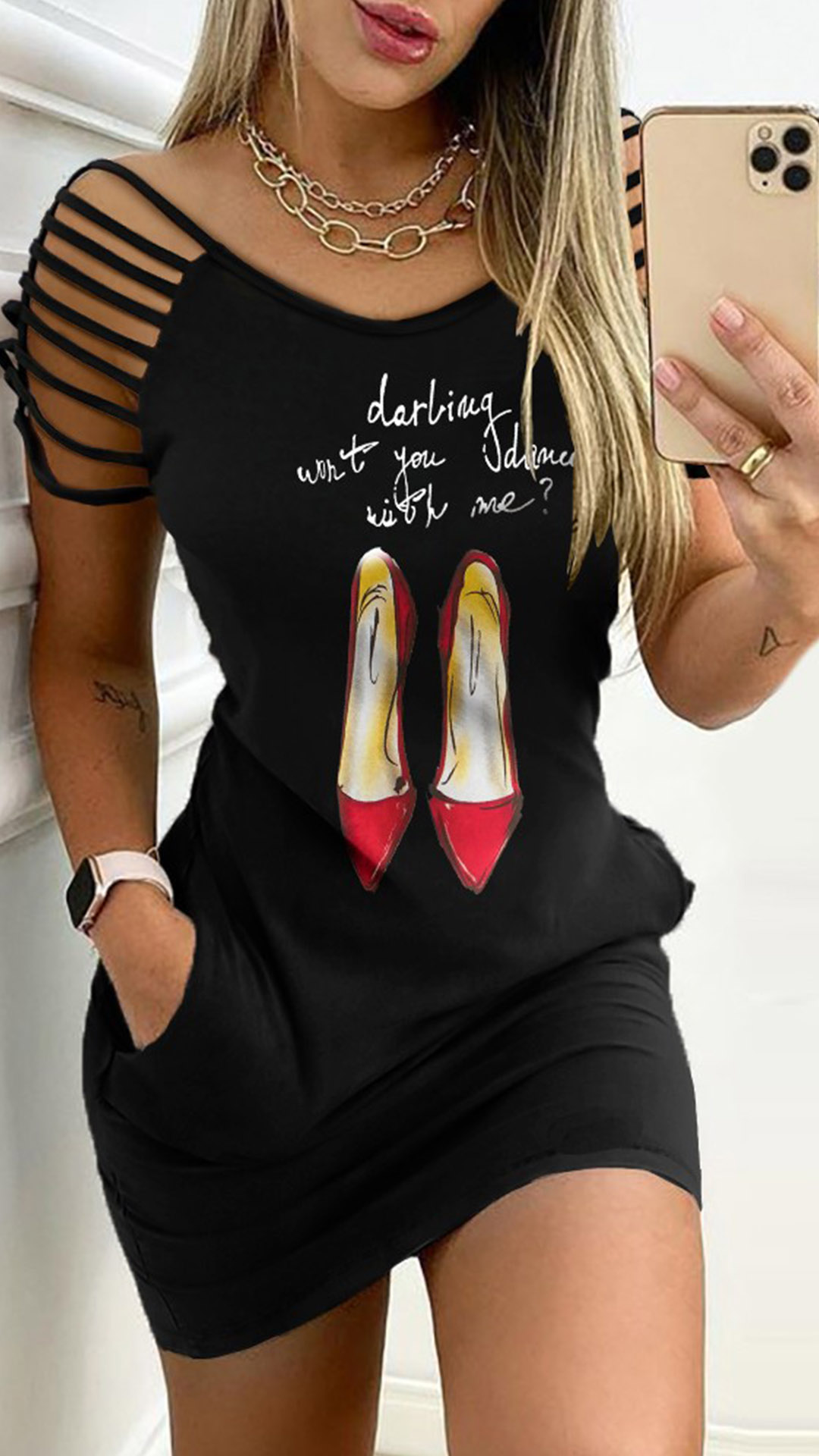Wanna draw more attention? Then let this dress help you. The unique short sleeve with hollow out design makes this piece look so attractive and distinctive. Finished with round neck,heels/flower pattern and a fit silhouette,this dress is a good weapon to express your beauty and charm.