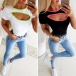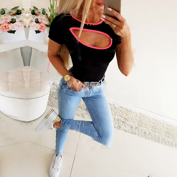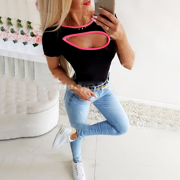 Combines of cozy,stylish and flirty vibes,this t-shirt is yearning for a place in your wardrobe. Contrast color element and hollow out design make this piece look so attractive,while the fit silhouette design can showcase your perfect body-line. Try to match with your favourite pants to finish a fashionable daily look.