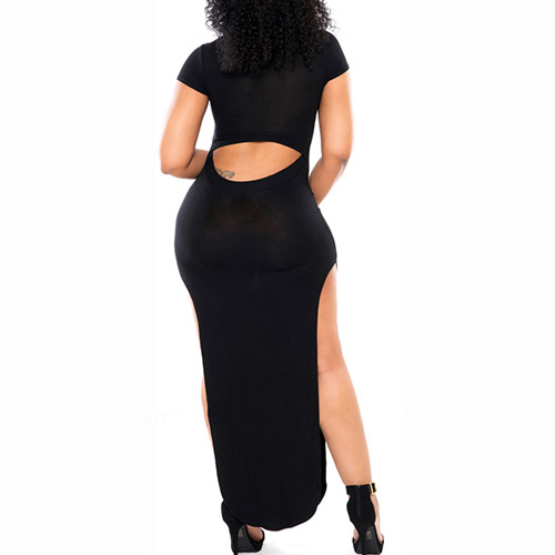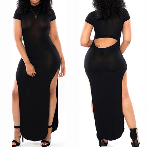 Boasting a flattering black color,its hollow out,slit hem and maxi length makes this dress look more