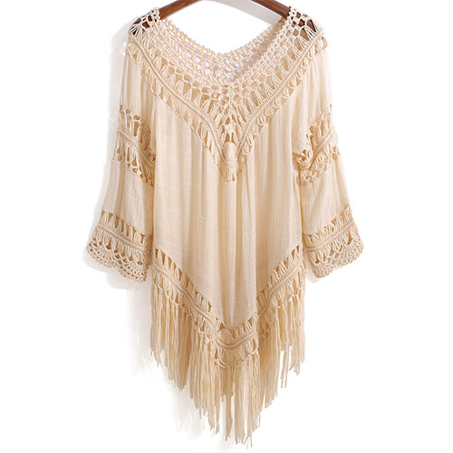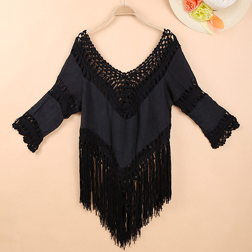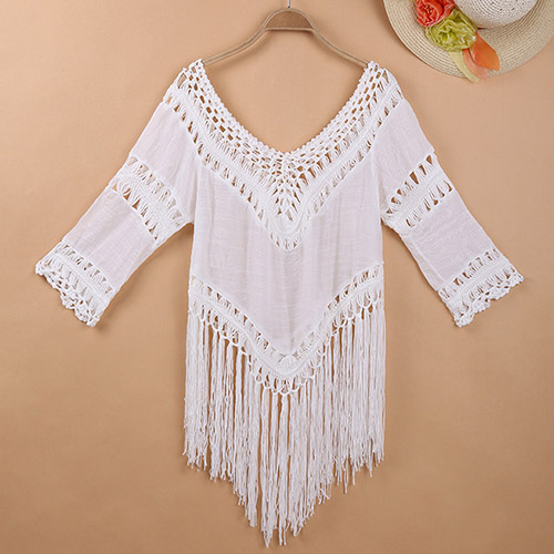 Sexy Hollow Out Tassel Hem 3/4 Sleeve Bikini Smock