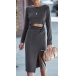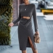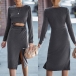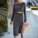 Sexy Hollow Out Twisted High Waist Slit Hem Long Sleeve Round Neck Dress