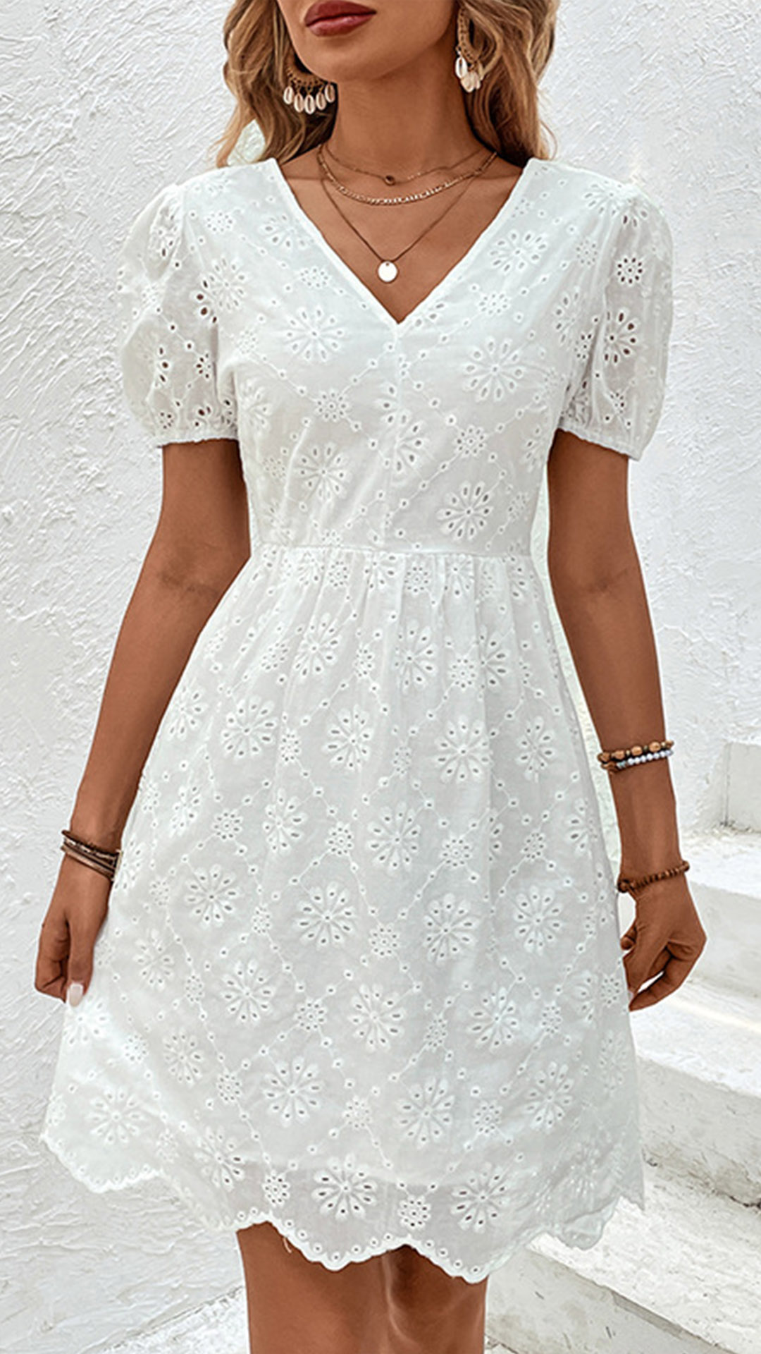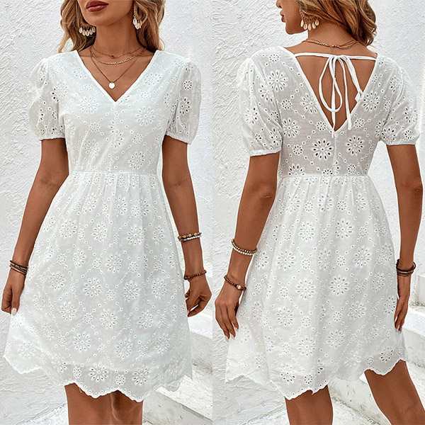 This dress features a hollow-out design, V-neckline, short sleeves, and a backless silhouette for a sexy and stylish look. Wanna have one?