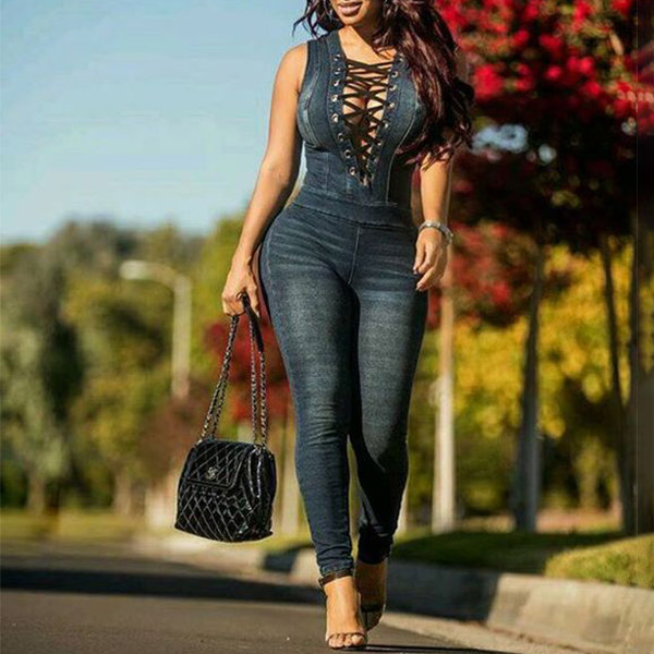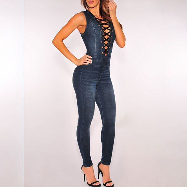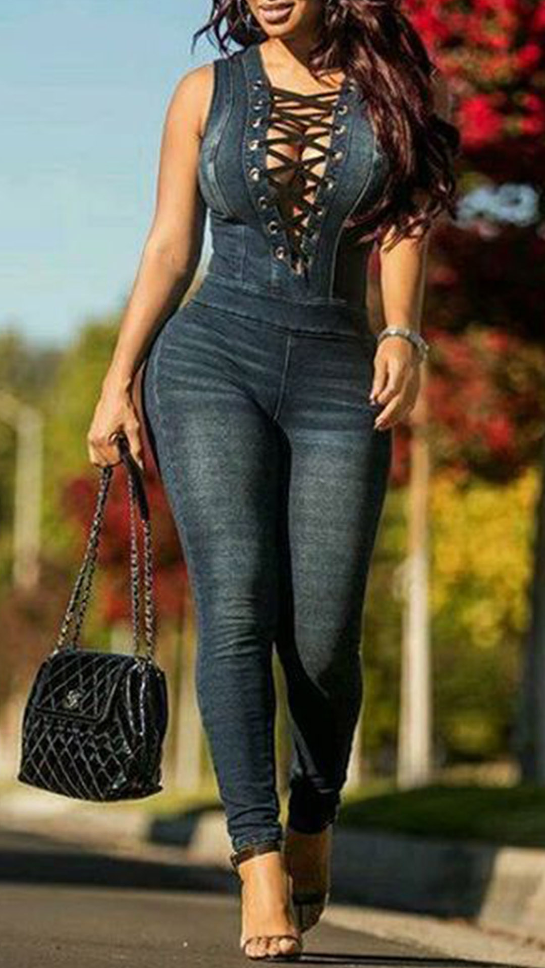 Wow,how could you look so flirty and charming in this denim jumpsuit! The hollow out lace-up deep v-neck design makes this piece look so sexy and alluring. Finished with sleeveless,high waist and a fit silhouette,this little stunner also can portray your perfect and slender figure. So why not take interest in it?