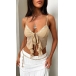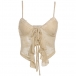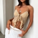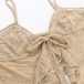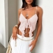 This is a trendy and stylish cami top that exudes confidence and allure. The jacquard fabric adds a touch of texture and sophistication to the top, creating a luxurious and eye-catching look. The self-tie V-neck design offers a flattering and alluring neckline. While the ruffle accents add a feminine and flirty touch, creating movement and adding a chic flair to the top.Pair it with high-waisted jeans or a skirt for a sleek and stylish look.