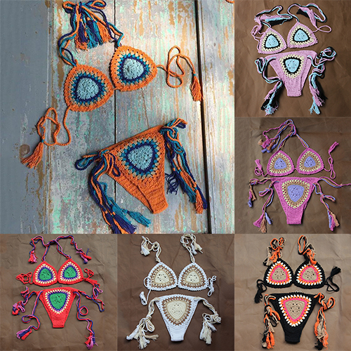 Crafted from knit crochet, this string bikini set features a triangle halter bikini top and a string bikini bottom.