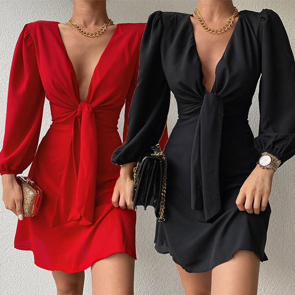 Still worrying about what to wear for your night events and weekend gatherings? Then make your eyes focused on this dress. Solid color style,the lantern sleeve,deep v-neck and knotted design make this piece full of sassy and flirty vibes. Dress it up with your sexy heels for a beautiful look.