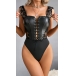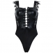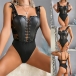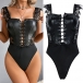 Sexy Lace Spliced Artificial Leather Front Lace-up Backless Lingerie Bodysuit