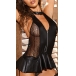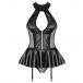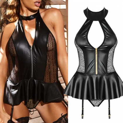 Sexy Lace Spliced Artificial Leather Zipper Halter Bodysuit