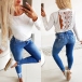 Sexy Lace Spliced Backless Long Sleeve Round Neck Solid Color Top