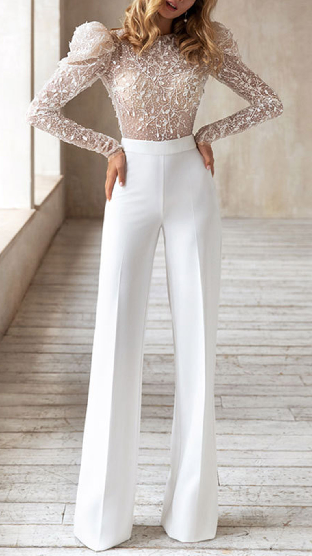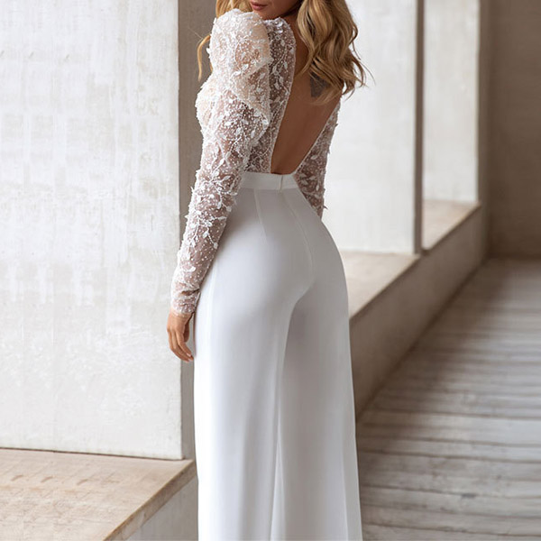 Looking for a unique and sexy jumpsuit that will turn heads? Try this one! This one-of-a-kind jumpsuit features a lace spliced bodice with a backless design, long sleeves, a wide-leg silhouette, and a puff sleeve detail. It's perfect for a night out on the town or a special event. You'll love the way you look and feel in this jumpsuit.