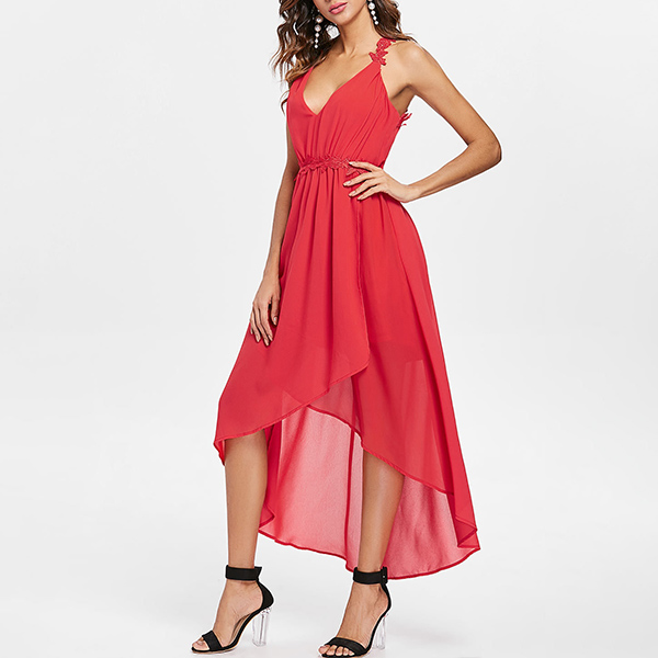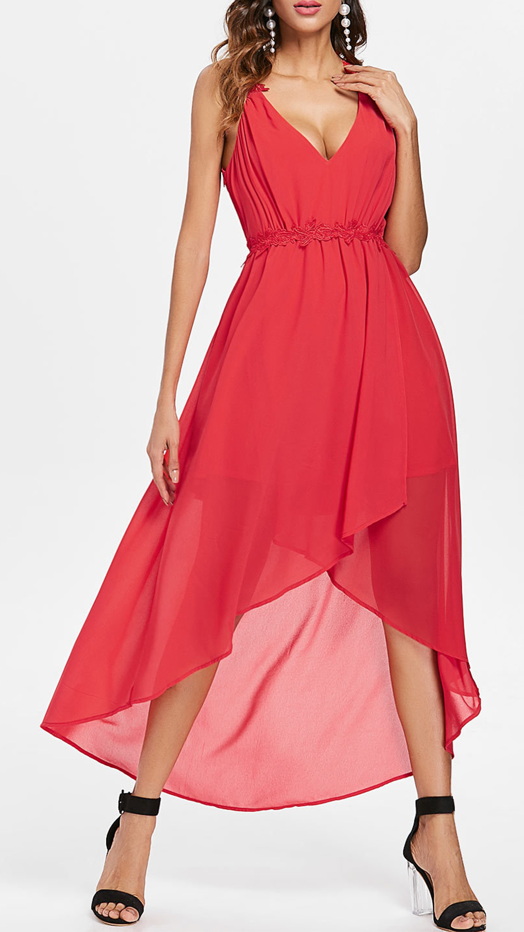 Injecting some flirty appeal on your weekends is easy when dressing up with this chiffon dress. The backless,v-neck and lace spliced details will make this piece full of flirty and alluring sense,while the high waist and high-low hem design will make this piece look more attractive and stunning. You can easily be the focus when you are in this dress.