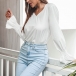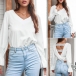 A perfect combination of sassy and flirty vibes,this wonderful top is worth to arouse your attention. Comes with a classic white tone,the v-neck,backless,trumpet sleeve and lace spliced details at the back side make this piece look more attractive. Perfect fit for matching with different style bottoms like shorts,skirts,jeans and so on.