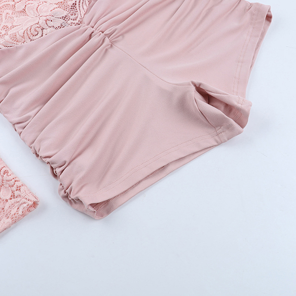 This sophisticated romper features classic crew neck styling with romantic lace spliced detailing and flattering ruched construction for contemporary feminine elegance. Perfect for party wear.