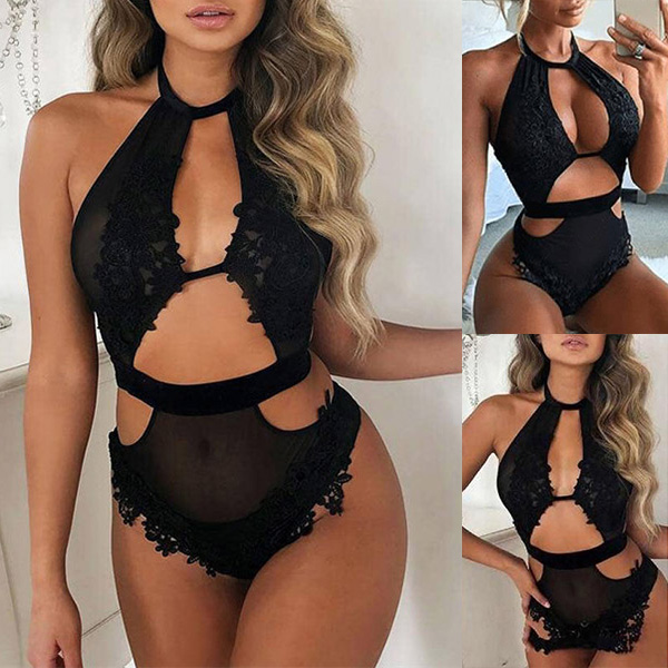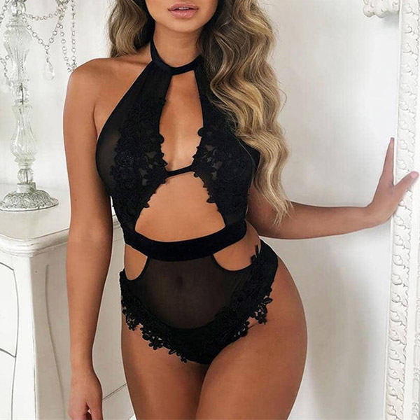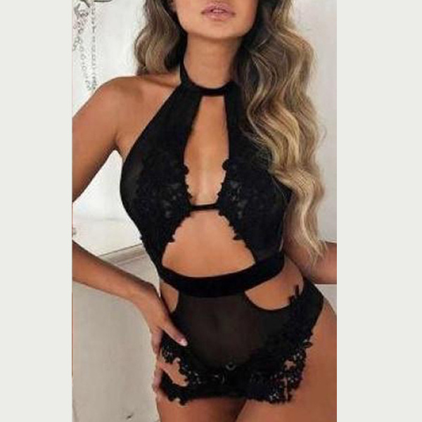 Sexy Lace Spliced Cutout Halter Lingerie Bodysuit