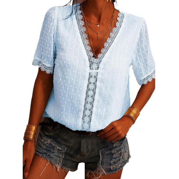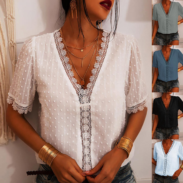 Combines of stylish and flirty vibes,this wonderful top is a good way to help you catch more eyes. Solid color style,the v-neck and lace spliced details can help enhance your feminine appeal. Meanwhile,its soft and breathable fabric can give you a comfortable day. You can match with a tight pants to start your wonderful day!