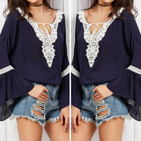 Its sexy and alluring details like deep v-neck,trumpet sleeve and lace spliced design make this piece so distinctive