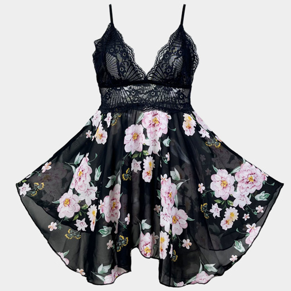Sexy Lace Spliced Floral Printed V-neck Backless Nightwear Dress