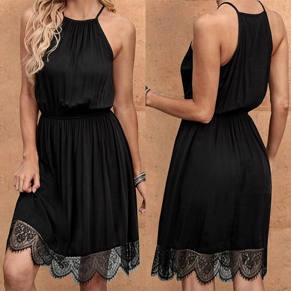Sexy Lace Spliced Hem Elastic Waist Solid Color Sling Dress