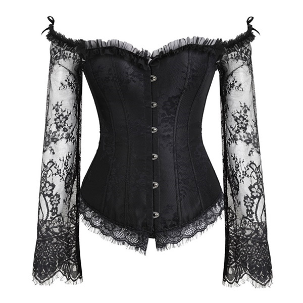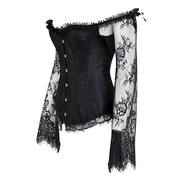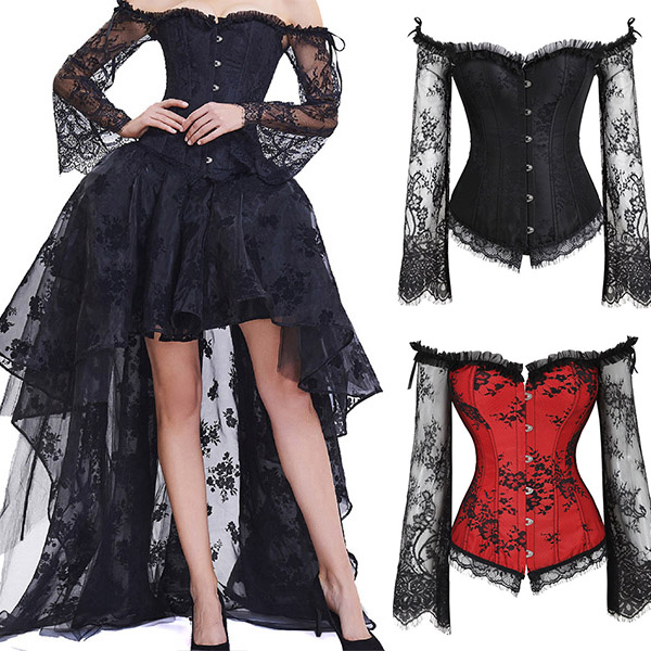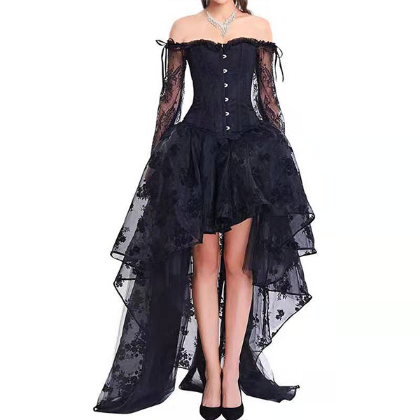 Vintage corset with lace spliced hemline and Lace trumpet long sleeve. The off-the-shoulder style is very flattering and will make you stand out on stage.