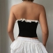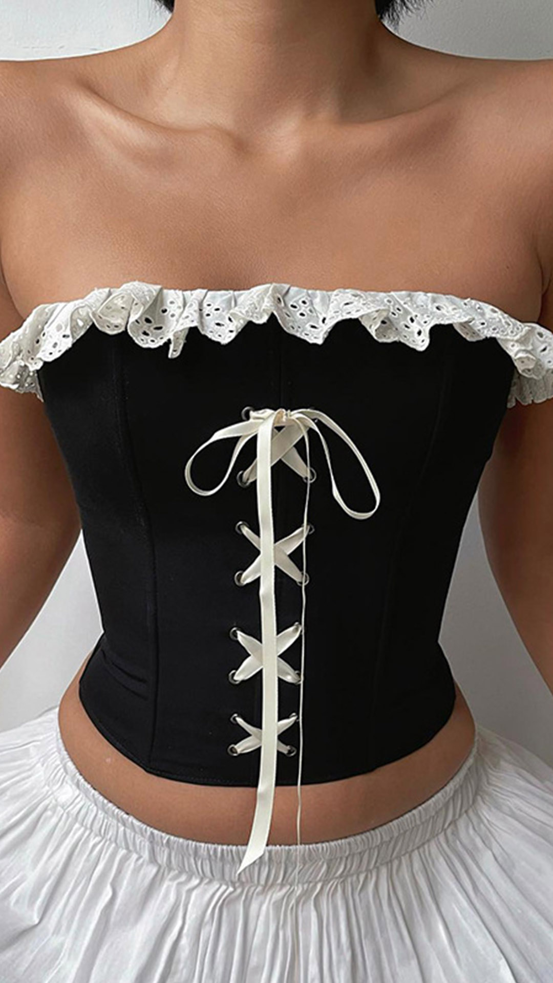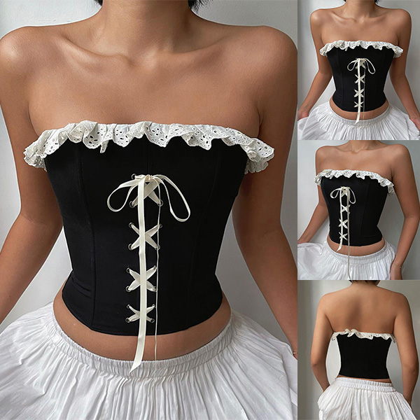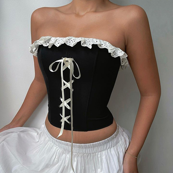 How about this crop top? The strapless bandeau style highlights your shoulders and collarbone, adding an elegant and seductive touch. The lace-up front adds a hint of playfulness and allows you to adjust the fit to your liking, enhancing your bust and creating a flattering silhouette. I like the lace ruffled design, and you?