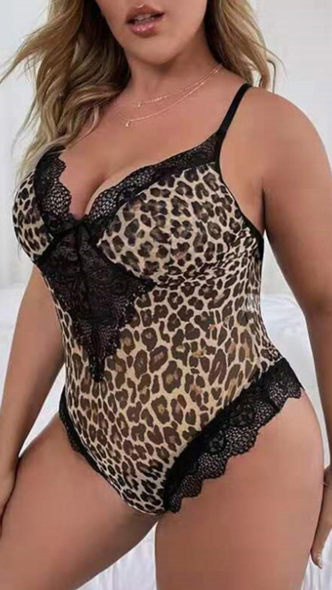 Sexy Lace Spliced Leopard Printed V-neck Pajamas Bodysuit