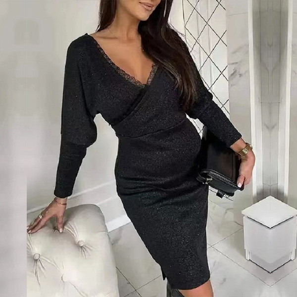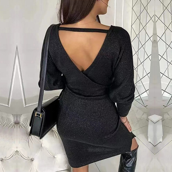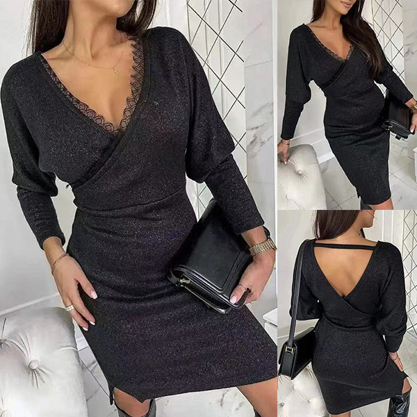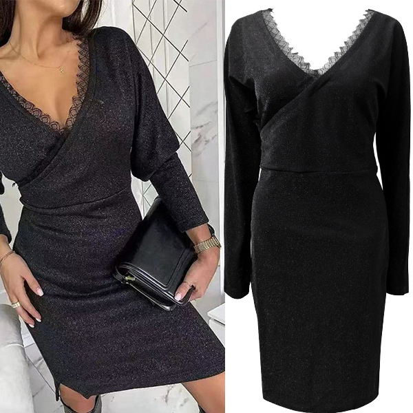 This dress features lace splicing along the V-neck, which adds a touch of allure and femininity to the design. The backless style creates a daring and eye-catching element, making this dress perfect for events where you want to make a statement.