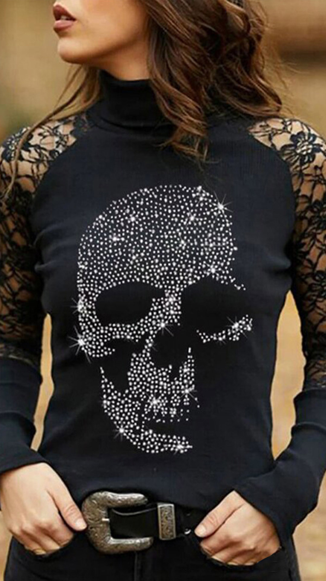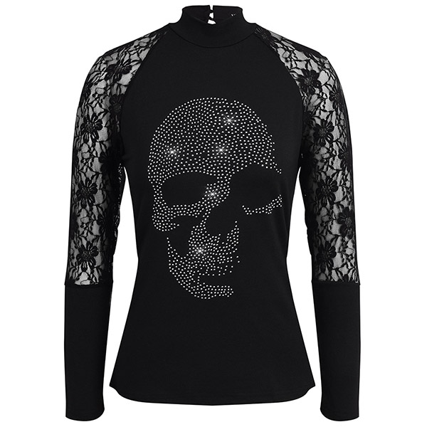 Sexy Lace Spliced Long Sleeve Mock Neck Rhinestone Skull Bottoming Top
