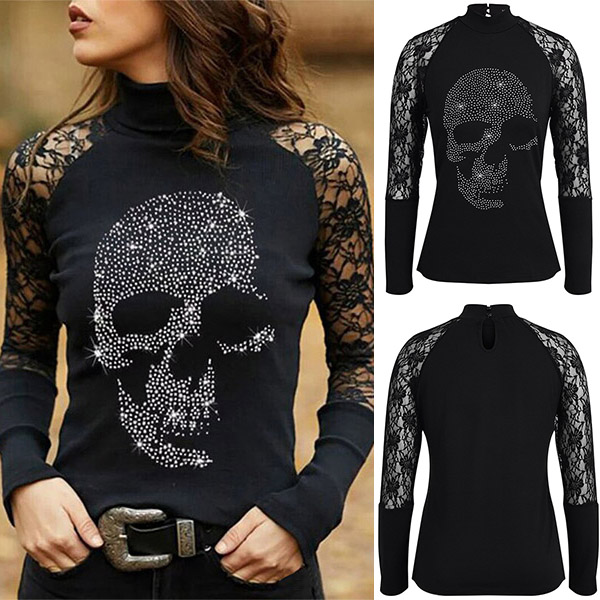 Inject some different vibes to your wardrobe with this bottoming top. The lace spliced details and rhinestone skull design make this piece look so sassy,sexy and distinctive. Crafted from soft and breathable fabric,with long sleeve and mock neck design,this top can offer you different matching opportunities.