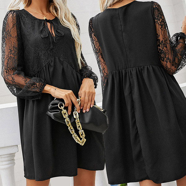 Sexy Lace Spliced Long Sleeve Round Neck Loose Dress
