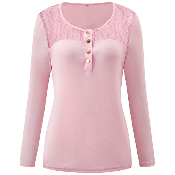 Don't like too simple and dull t-shirt? Then this piece can arouse your attention. The lace spliced details and button design will make this piece look more stylish and attractive. Another design highlight is that it can offer you different matching opportunities. So why not buy one?
