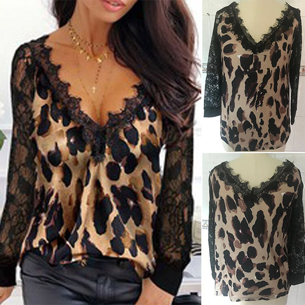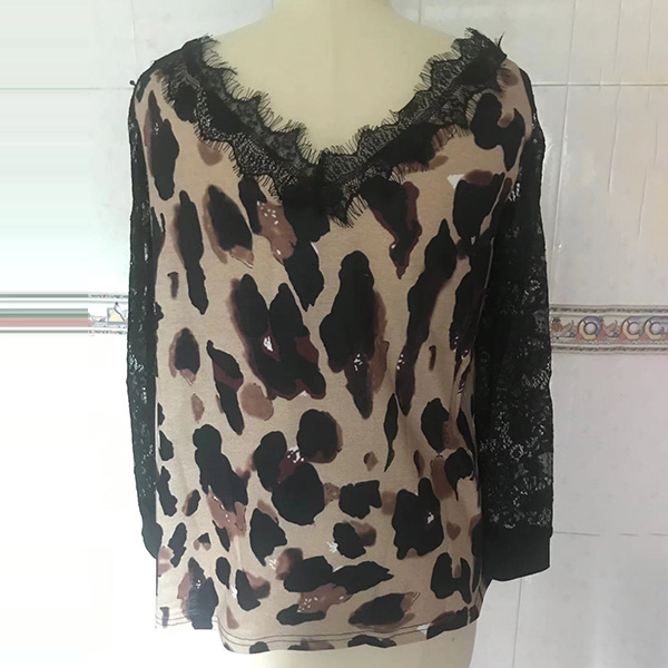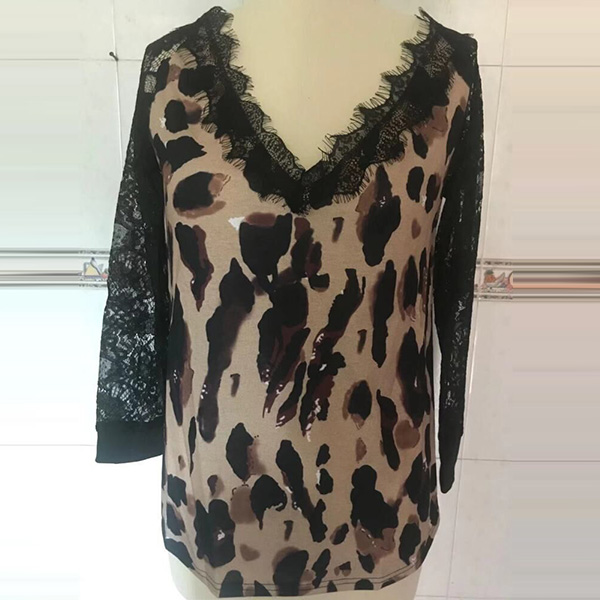Sexy Lace Spliced Long Sleeve V-neck Leopard Printed T-shirt