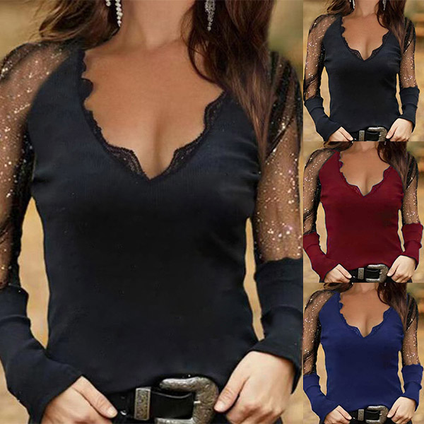 Sexy Lace Spliced Long Sleeve V-neck Solid Color Slim Fit Top