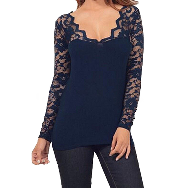 Sexy Lace Spliced Long Sleeve V-neck T-shirt