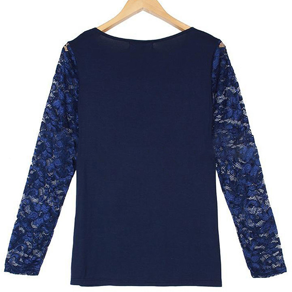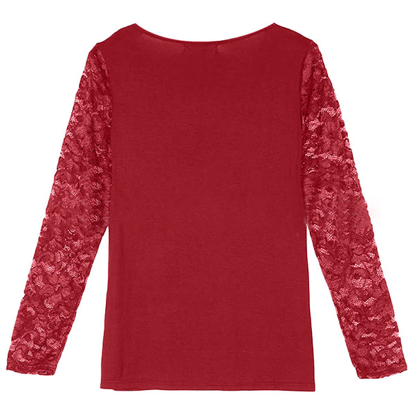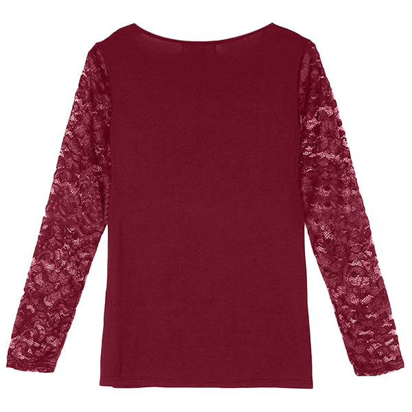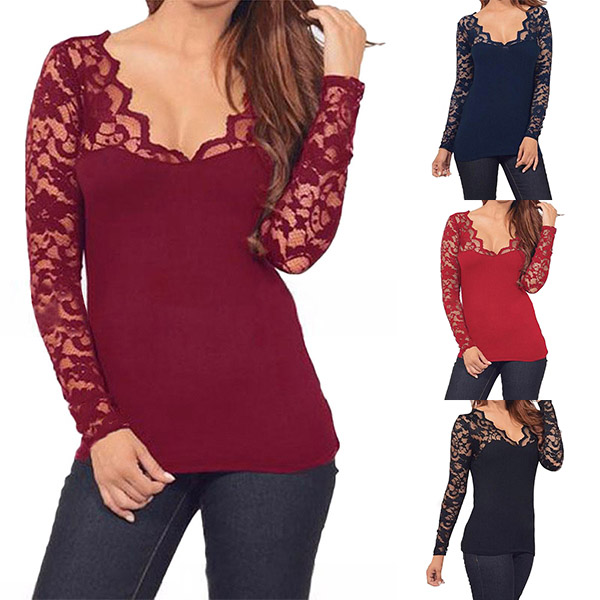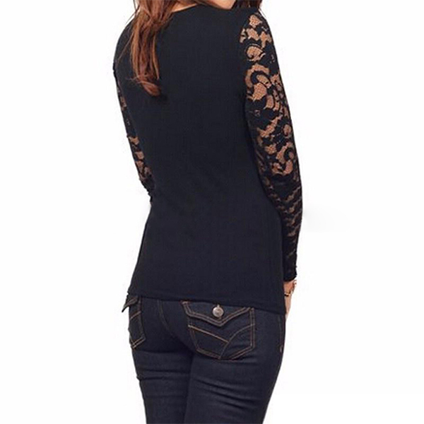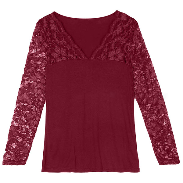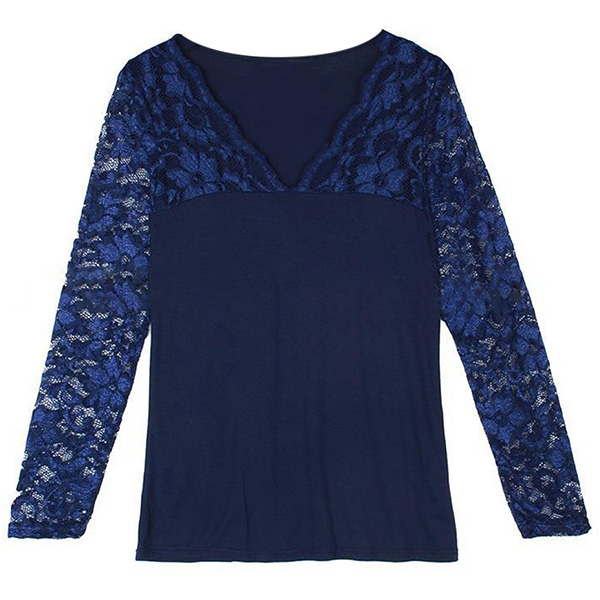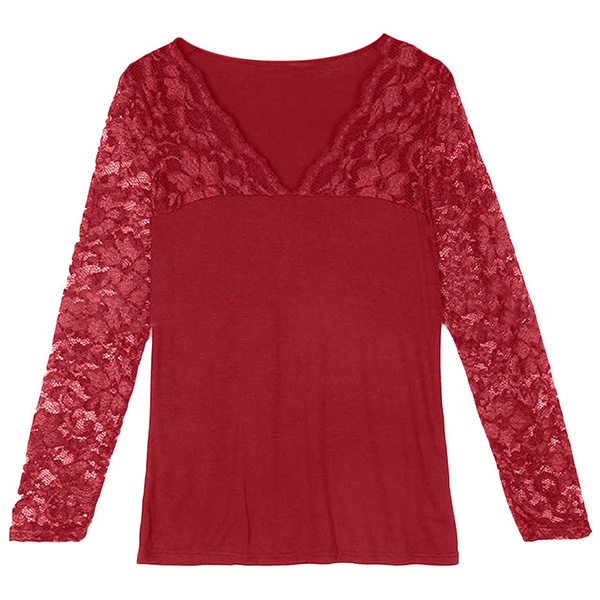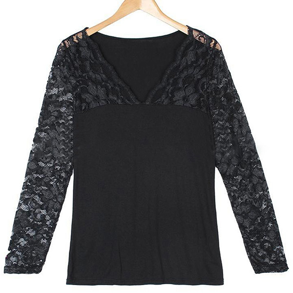 Combines of cozy,sexy and flirty vibes,this t-shirt is worth to arouse your attention. Solid color style,the lace spliced long sleeve and v-neck design can easily enhance its entire charm. This is a t-shirt which you can wear in different seasons. So why not take interest in it?