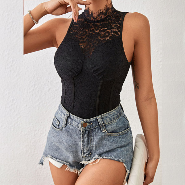 Sexy Lace Spliced Mock Neck Sleeveless Lace Bodysuit