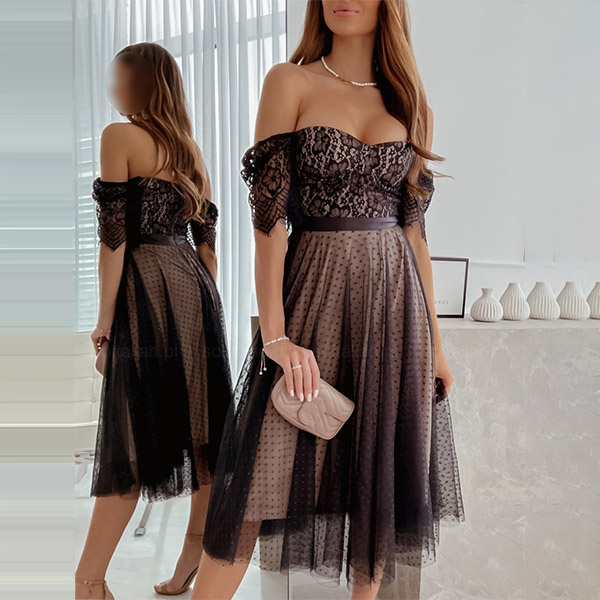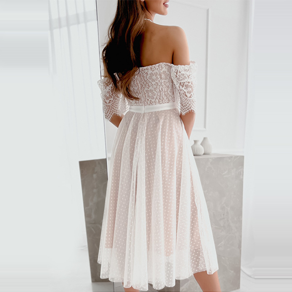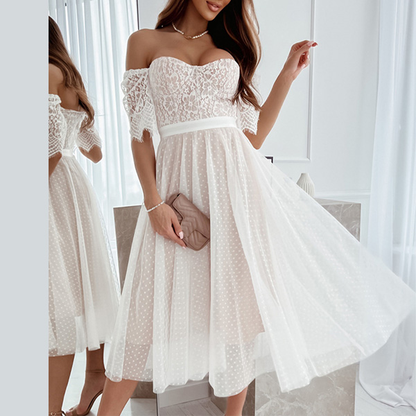 Sexy Lace Spliced Off-the-shoulder Short Sleeve Gauze Spliced Party Dress