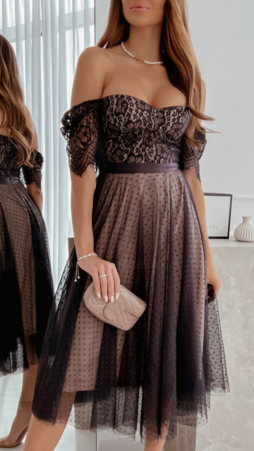 This gauzy party dress is perfect for a fun night out! It features a sexy off-the-shoulder neckline, short sleeves, and a lace spliced short sleeve. The fitted bodice and flared skirt are both super flattering, and the overall look is sure to turn heads.